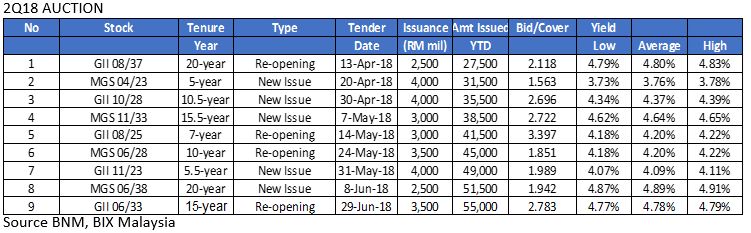Total Government bond matured during the quarter is RM7.5 billion while new and reopening auction issued at RM30 billion. The take up during the quarter is decent with the average btc at 2.3401 with the highest for 7 year GII 08/25 at 3.397 btc and lowest 5 year MGS 04/23 at 1.563 btc.