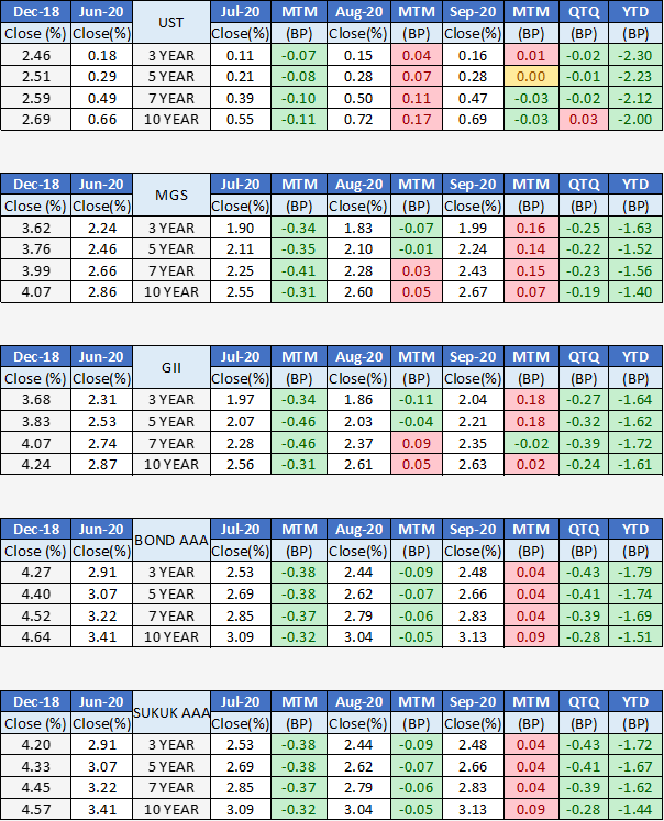 As economy reopened since May after three-month of movement restriction, the 3Q20 GDP improved with smaller contraction by 2.7% compared to 2Q20 with 17.2% contraction. The unemployment rate also improved from 4.9% in June to 4.6% in September. Overall MGS and GII declined in September due to concern on FTSE WGBI announcement. The FTSE decided to keep Malaysia’s bond in the index and next review will be in March 2021.